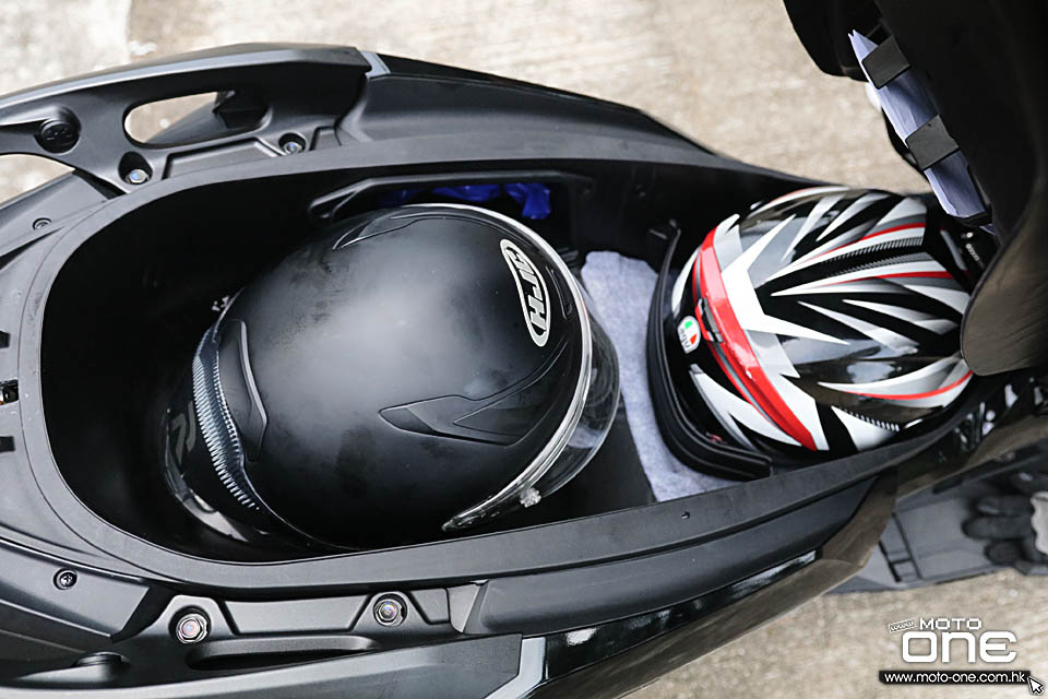 新款HONDA ADV350 座位下方配備48L儲物空間,可收納兩個全面賽車頭盔。 今次示範頭盔有大定風翼設計,一樣輕鬆收納,有剩餘很多空間,可以放置手套或車冚等雜物。