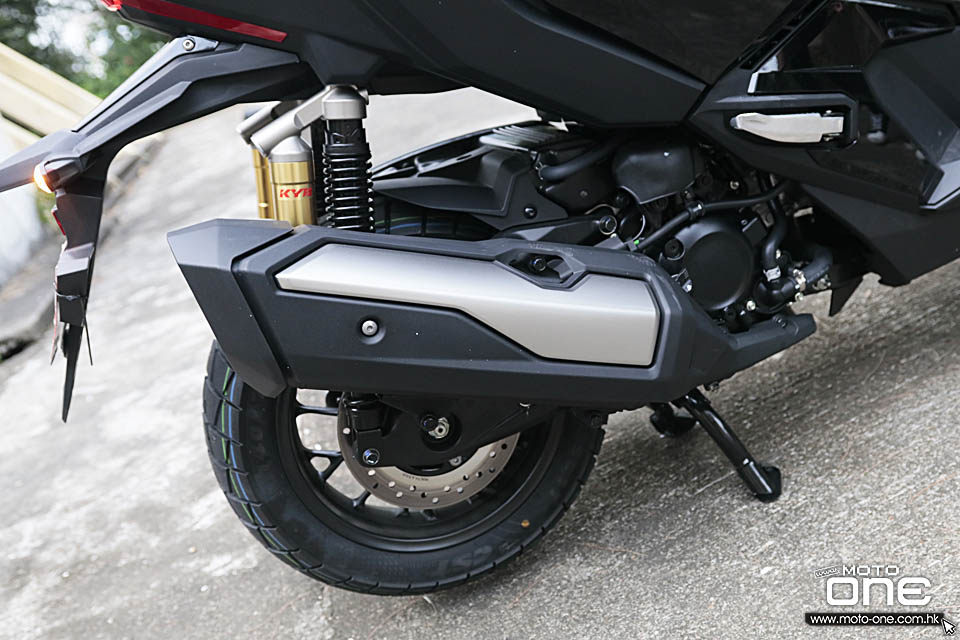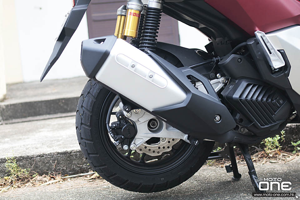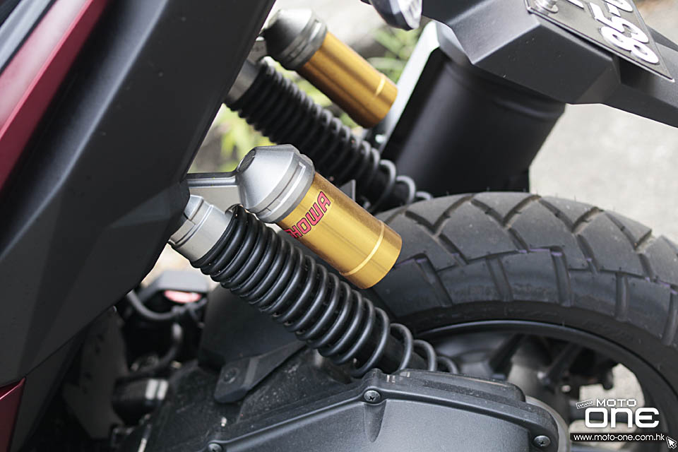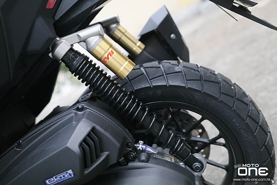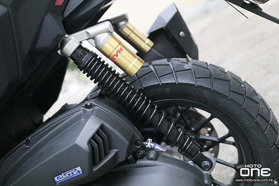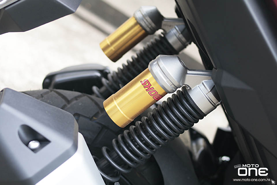 澳門版 ADV350 使用 KYB 油壓尾避震,吸震較柔和,過彎穩定度仍然良好。
