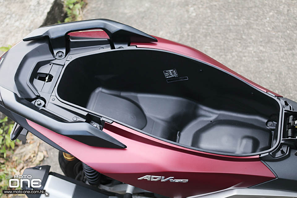 座位底空間比較 ADV350 的賣點之一,是座位下方擁有48L的「貨倉級」儲物空間,可同時收納 兩頂全面頭盔,旁邊仍有位置放置布冚、手套甚至水樽,非常實用。相比之下,ADV 160 座位下空間容量29L,可以放入一頂開面頭盔及乘客頭盔,同級車款來說儲物表現仍算出眾。