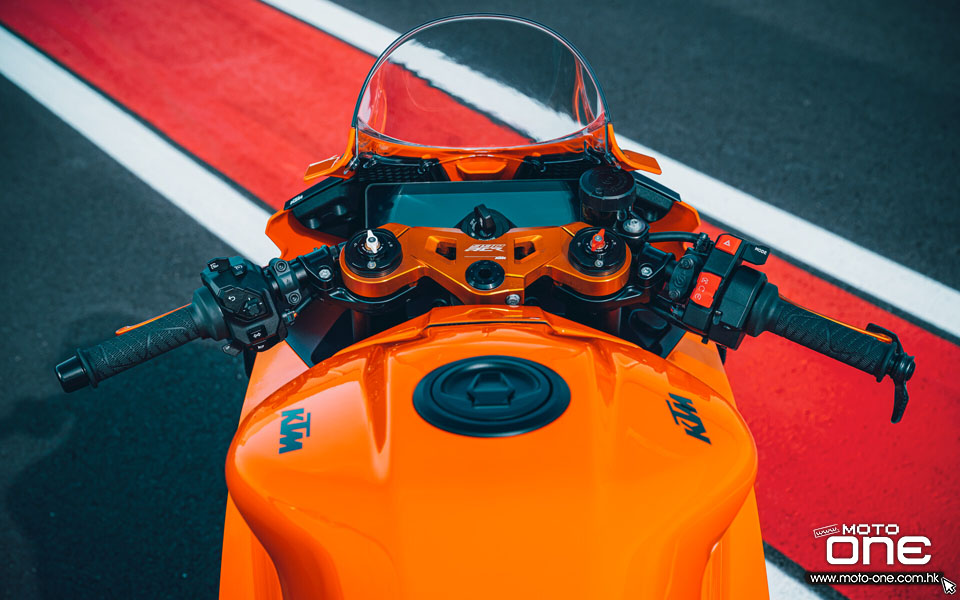 可調式倒立前叉 一如其他KTM車型,990 RC R使用WP避震,車子採用直徑48mm的WP APEX倒立前叉,行程130mm。這套系統以賽道為開發基礎,同時兼顧行駛與駕駛的靈敏度;每支前叉皆配上全新設計的33mm黑色陽極眼鏡(triple clamp),以應付高性能操控需求。