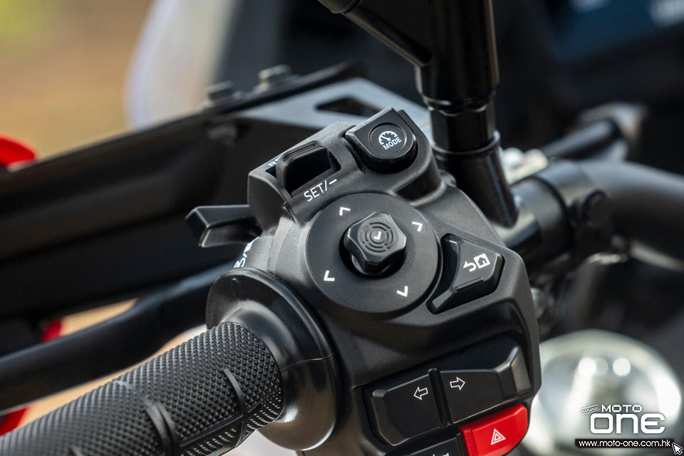 循跡控制系統(TCS)與後輪側滑控制系統(SCS)均設有三種模式——街道模式(STREET)、越野模式(OFF ROAD)與關閉模式(OFF),讓騎士可依照路況選擇系統輔助等級,確保在公路或越野時均能達致最佳循跡與側滑控制效果。