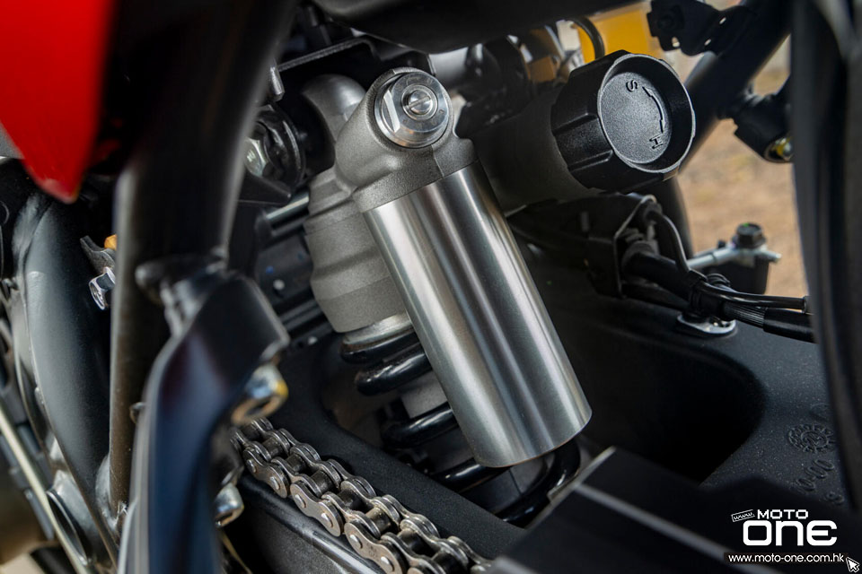 尾避震同樣採用 KYB 全可調單筒避震,行程220mm,並重新設計連桿結構,避震反應更線性且更具漸進性。
