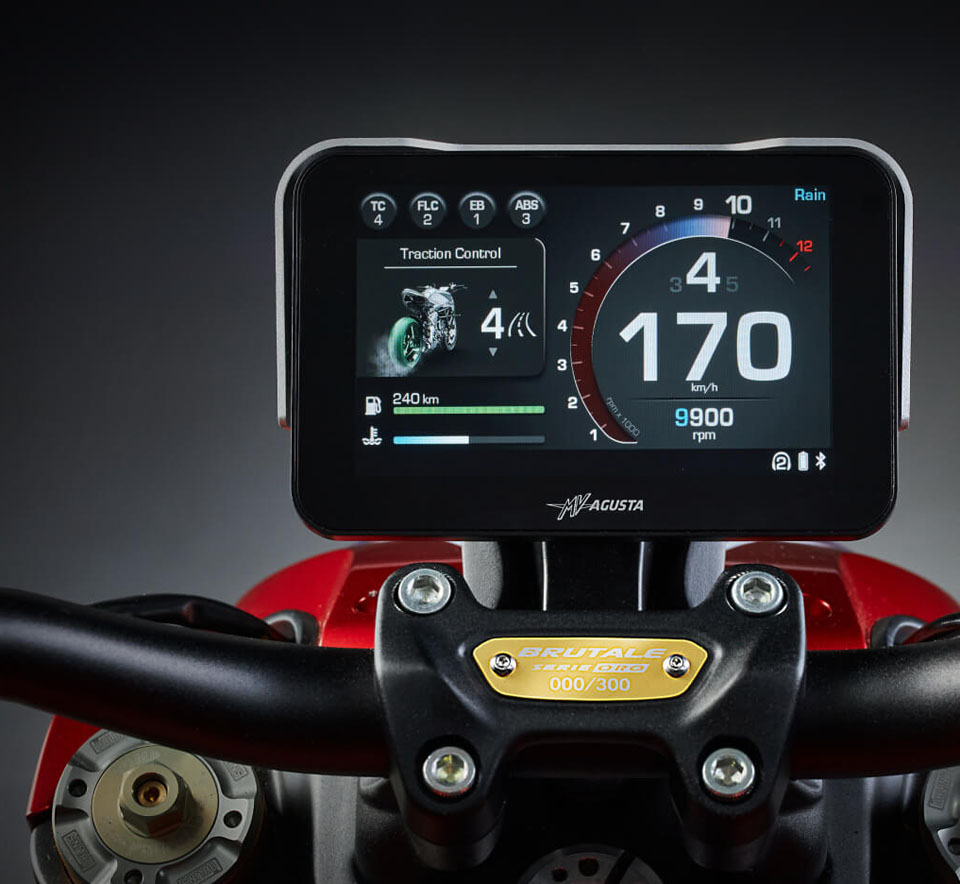 電子系統 全新的 5 吋全彩 TFT 儀錶擁有更高對比與更清晰顯示,內置兩種介面,並提供五種駕駛模式:Rain(雨天)、Urban(城市)、Sport(運動)、Race(賽道)及 Custom(自訂),騎士可調整循跡控制、ABS、引擎煞車與油門反應。
