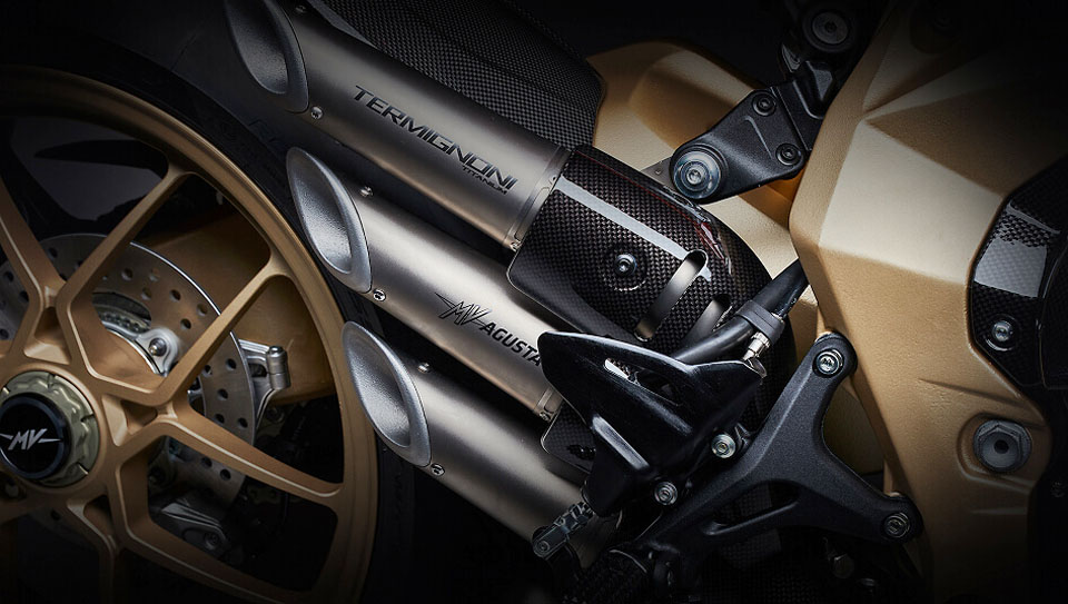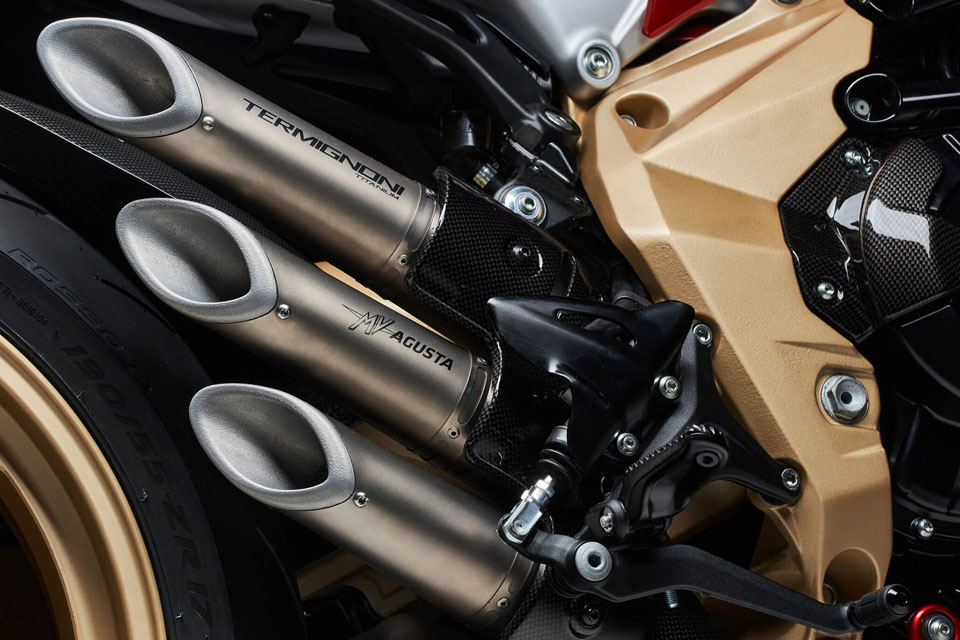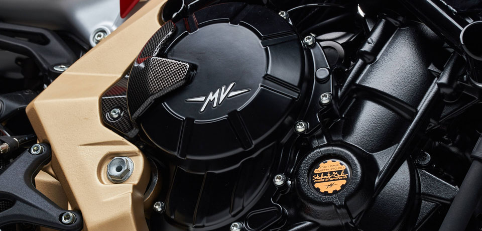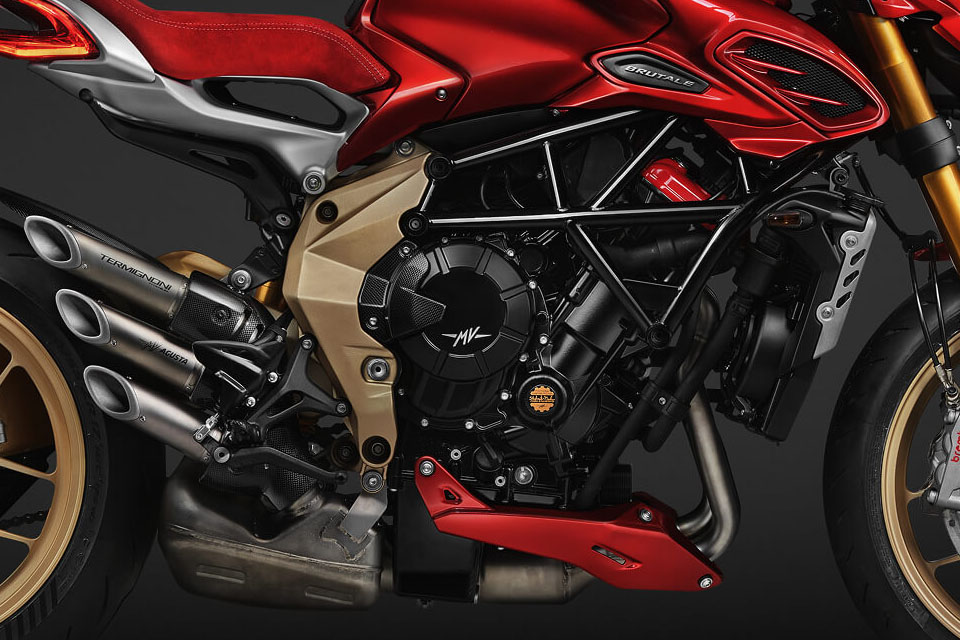 三缸引擎 Brutale Serie Oro 採用全新 950 EVO 三汽缸引擎,它源自同廠冒險型 Enduro Veloce 所使用的 931cc 引擎,但經過全面強化。新引擎採用反向旋轉曲軸、更大的鋼製氣門、新設計的氣缸頭與凸輪軸、重新設計的燃燒室,以及改良的冷卻與潤滑系統。最大輸出達 148 匹馬力/11,200 rpm、107Nm 扭力/8,400 rpm,而在 3,500 rpm 時已可輸出 85% 的扭力。屬於一款扭力型 NK 車,在市區騎乘時無須頻頻轉波。
