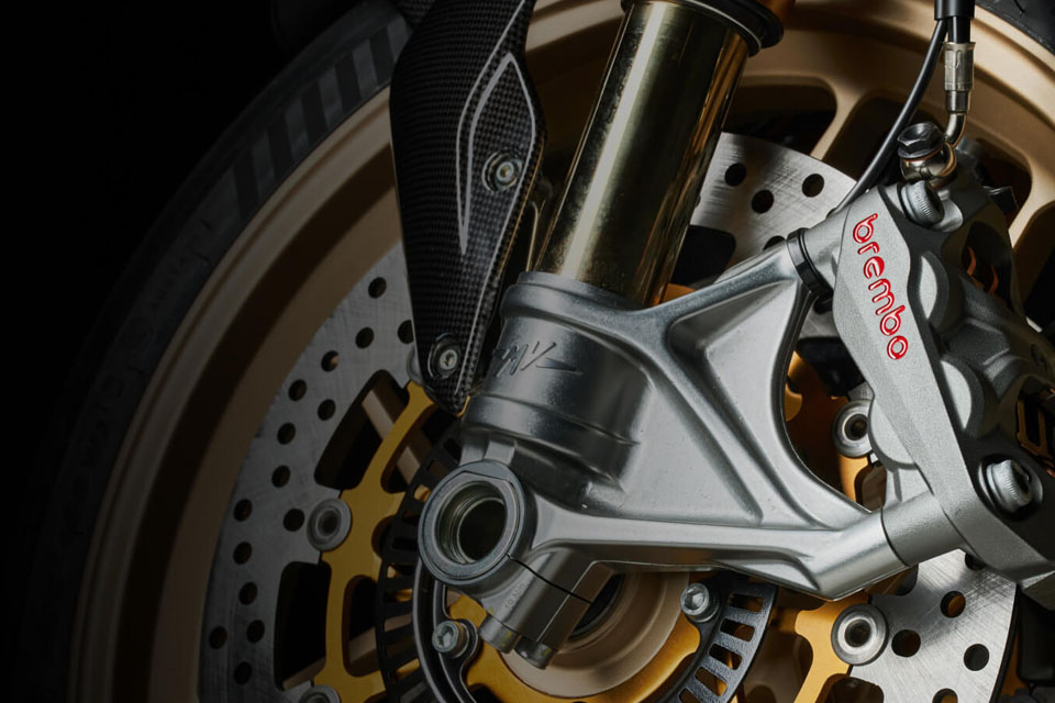 懸吊與煞車系統 避震使用 Ohlins,全套高規配備:前叉為 NIX 30 43mm 倒立式前叉,後避震為 TTX 36,提供壓縮、回彈與預載調校。煞車系統採用頂級 Brembo Hypure 放射式卡鉗、17mm 直推式煞車總泵、320mm 前雙碟及 220mm 後碟。