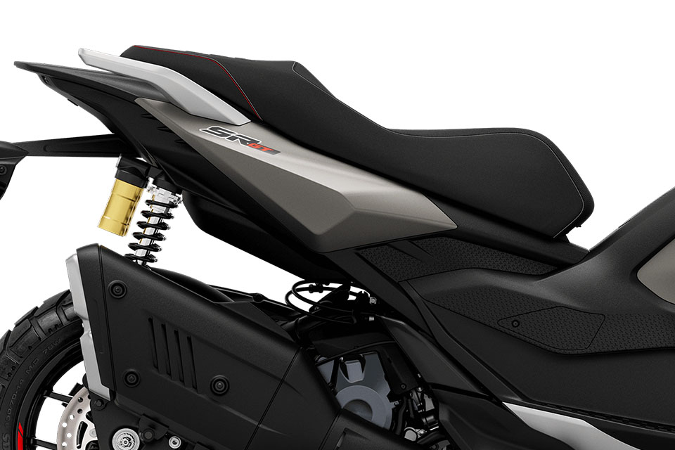 配合引擎升級,懸掛系統亦全面強化。前叉由原本 SR-GT 200 的 33mm 正立前叉升級為 41mm 倒立前叉,行程維持 120mm;後方雙筒彈簧避震則加入氣樽設計,提供 12mm 預載調校,行程達 120mm,比 SR-GT 200 的 102mm 更長,整體支撐與吸震表現均有所提升。