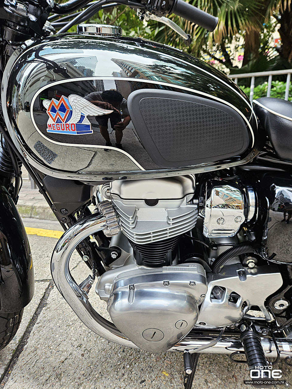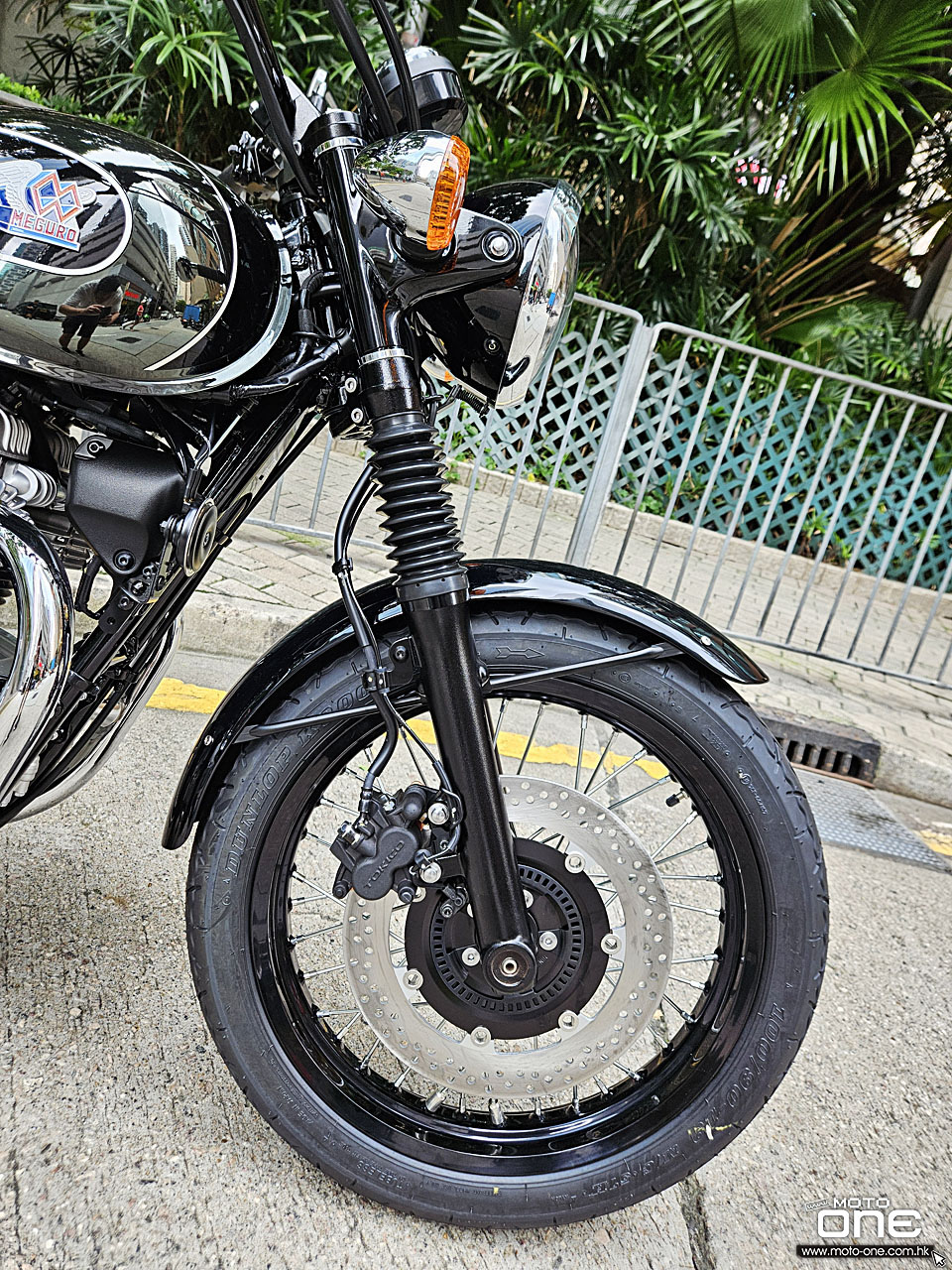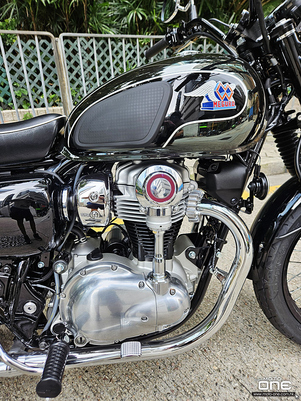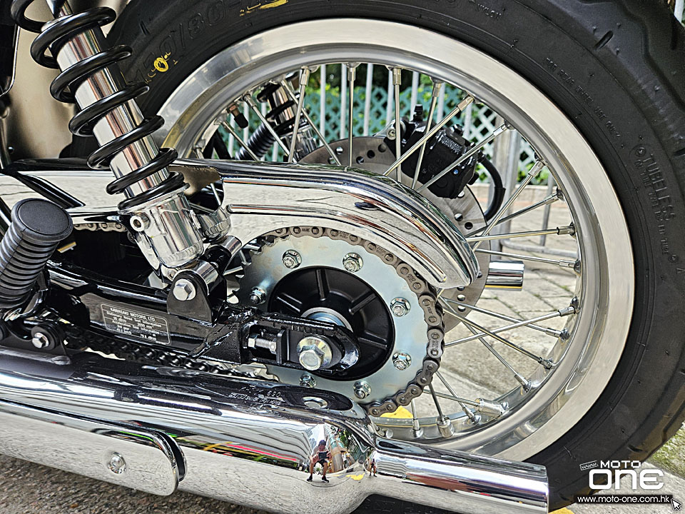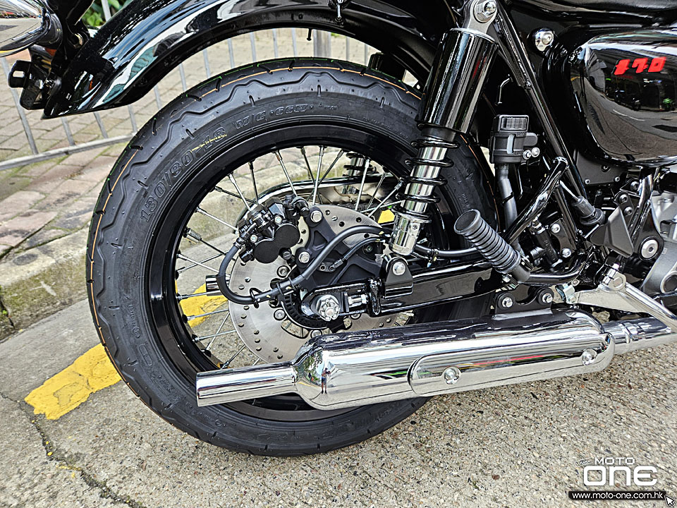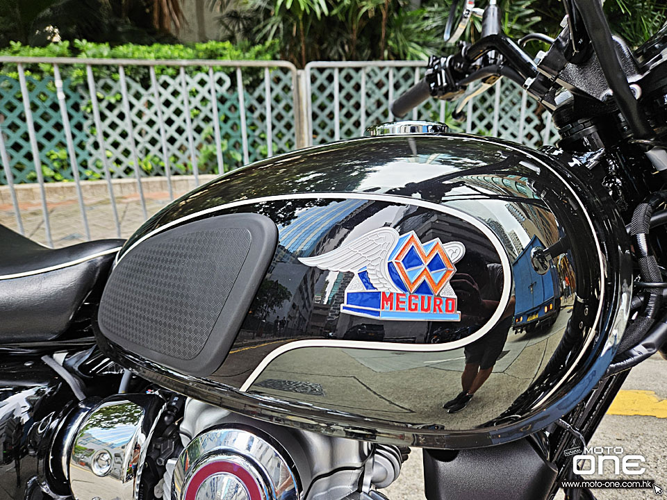 MEGURO K3繼2021年推出後,2026年裝備維持不變,而2026年款變上亮黑的前後輪框,油缸採用黑色鏡面塗裝加琥珀色組合,反射出特別的色彩效果,而兩側同有MEGURO經典圖案,但拉花亦與2021年款有所改變。
