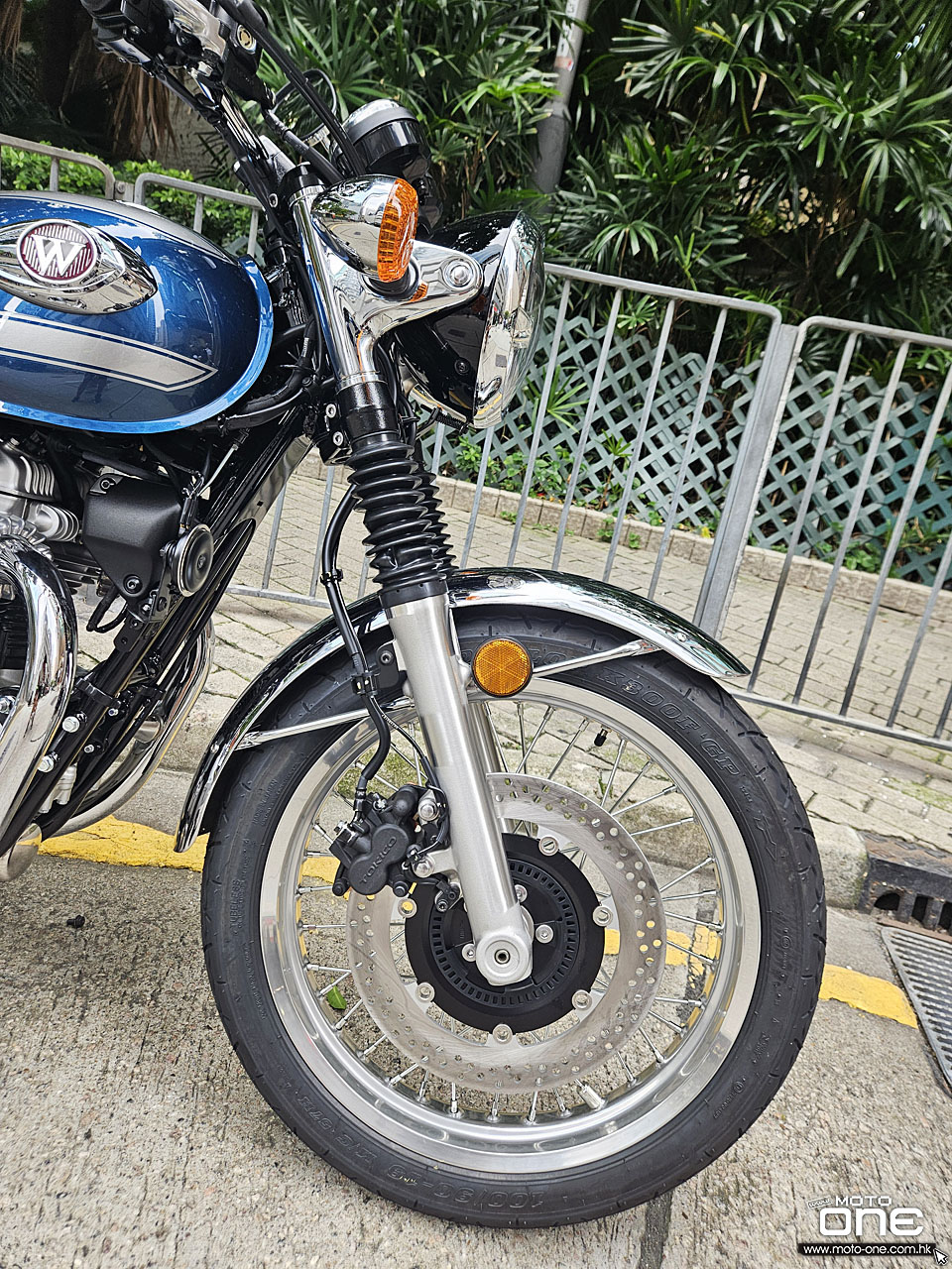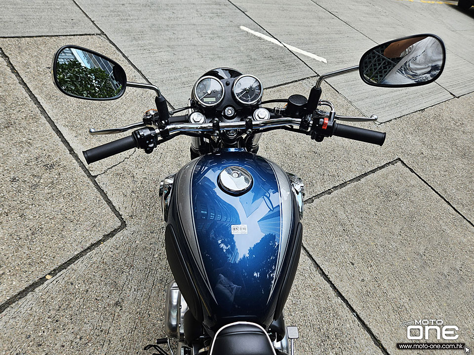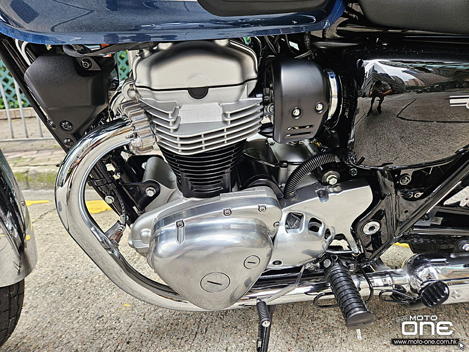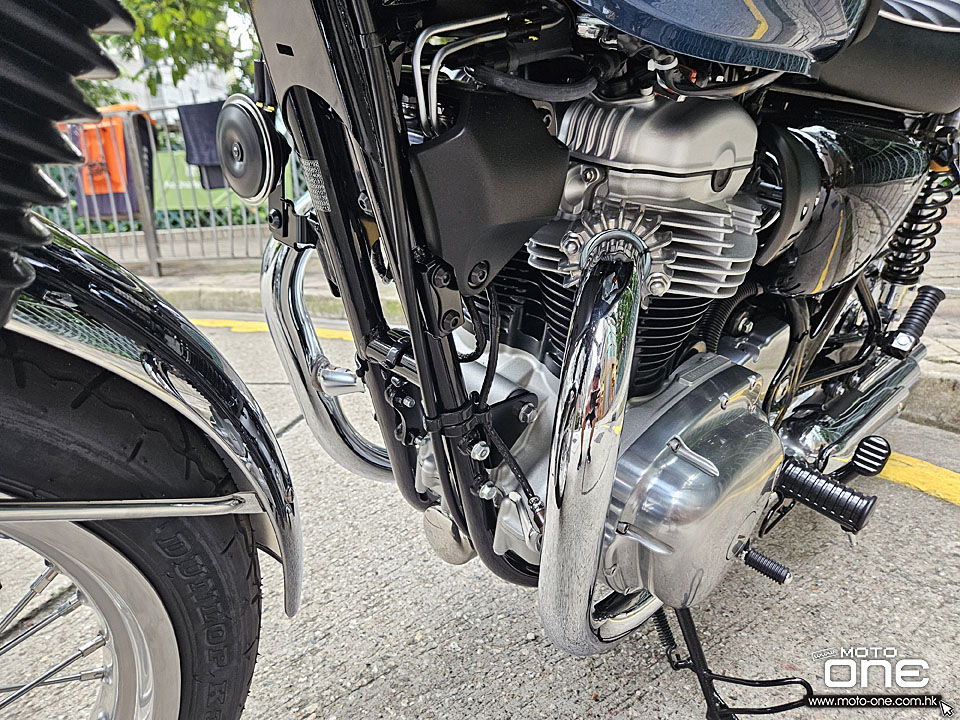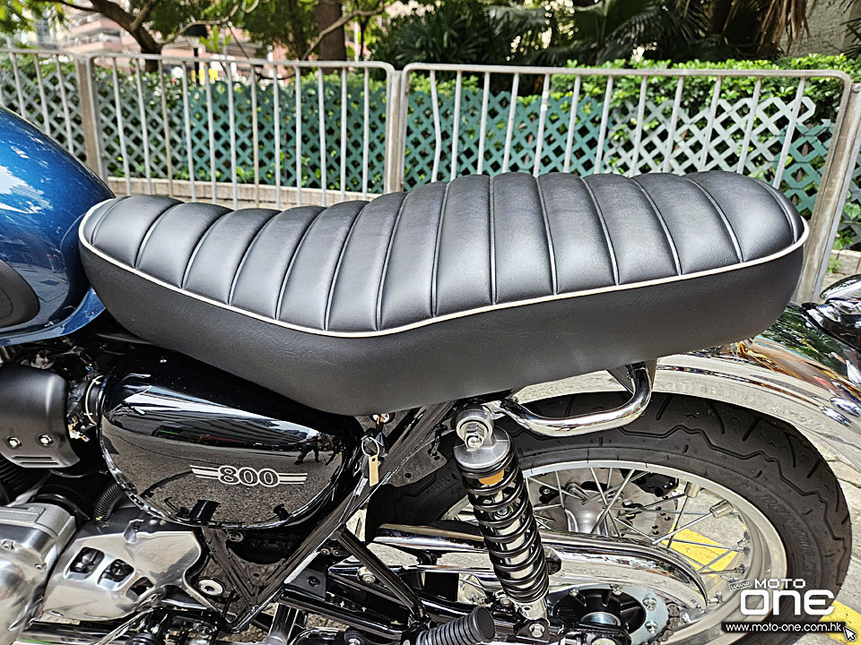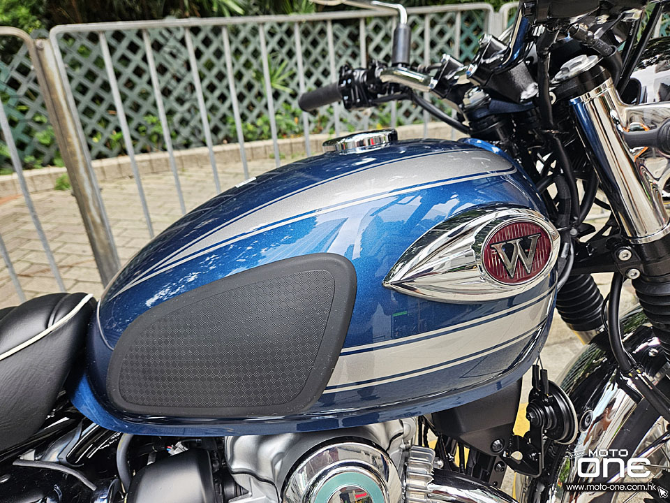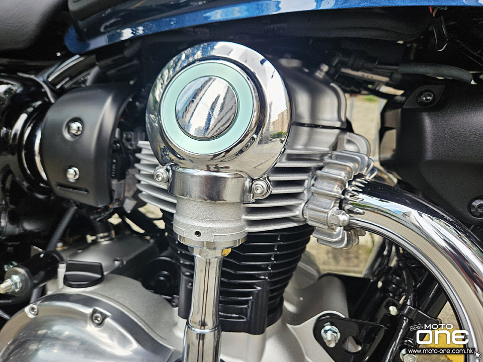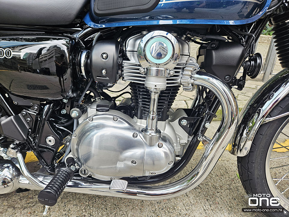 2026 Kawasaki W800 與過往相同,車身選用許多電鍍及金屬原色部件,閃亮與復古兼備,而今年W800汽缸採用藍色油缸,與金屬原色與電鍍的部品,完全的配搭。