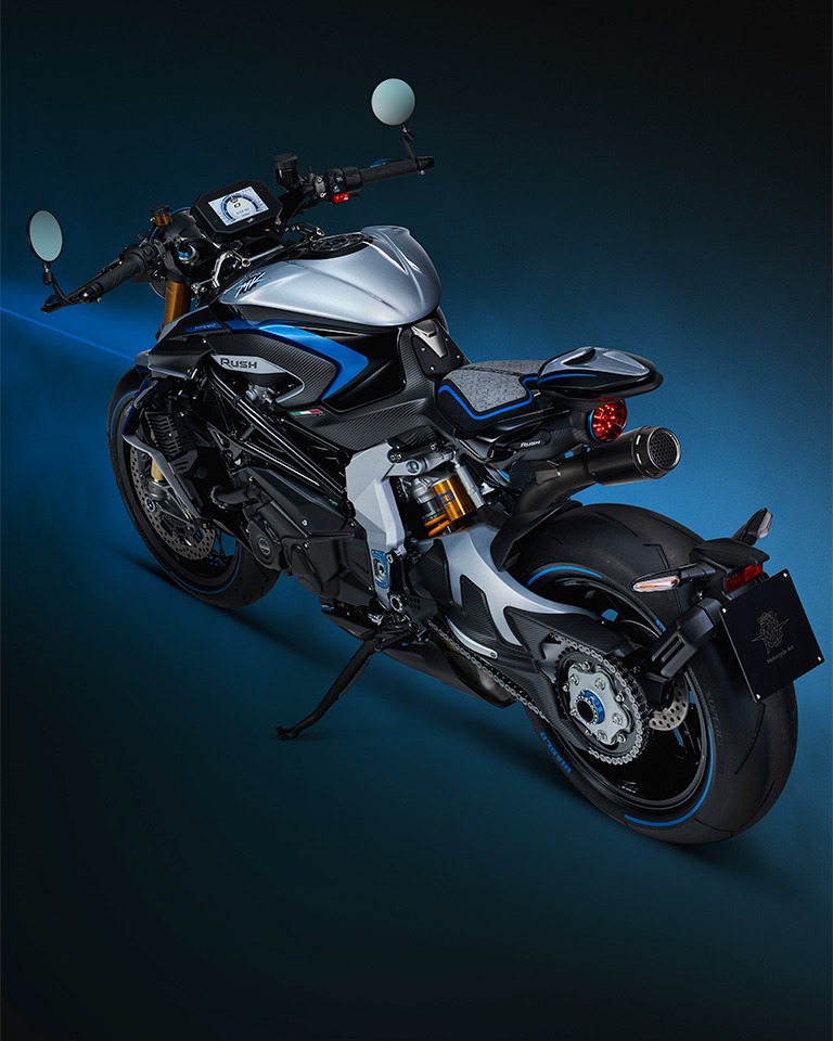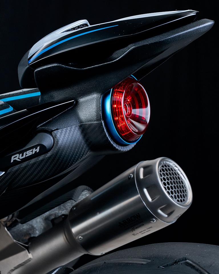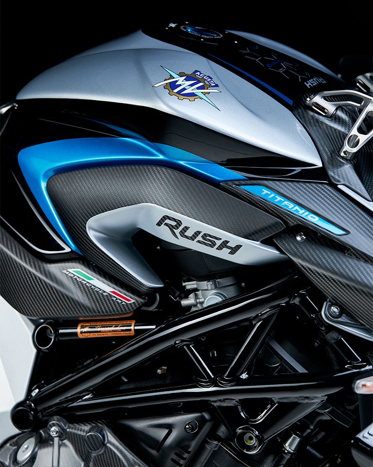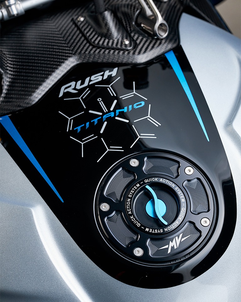 碳纖維依然是RUSH的重要配置。MV AGUSTA表示,TITANIO版本的所有碳纖部件均改用全新的斜紋織紋表面處理,取代以往的紋理設計;同時,部分經陽極處理的鋁合金零件,亦統一採用專屬的「Blu Titanio」「鈦藍色」色調作為點綴。