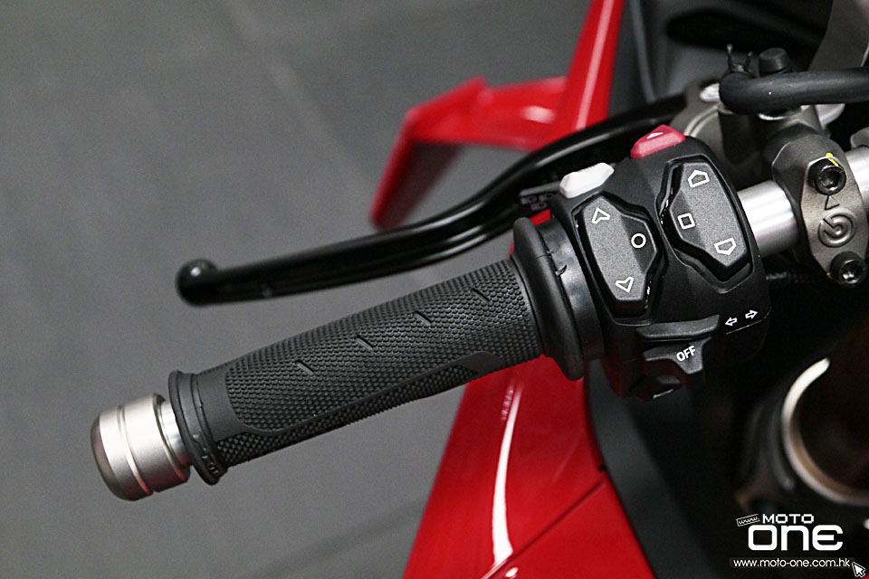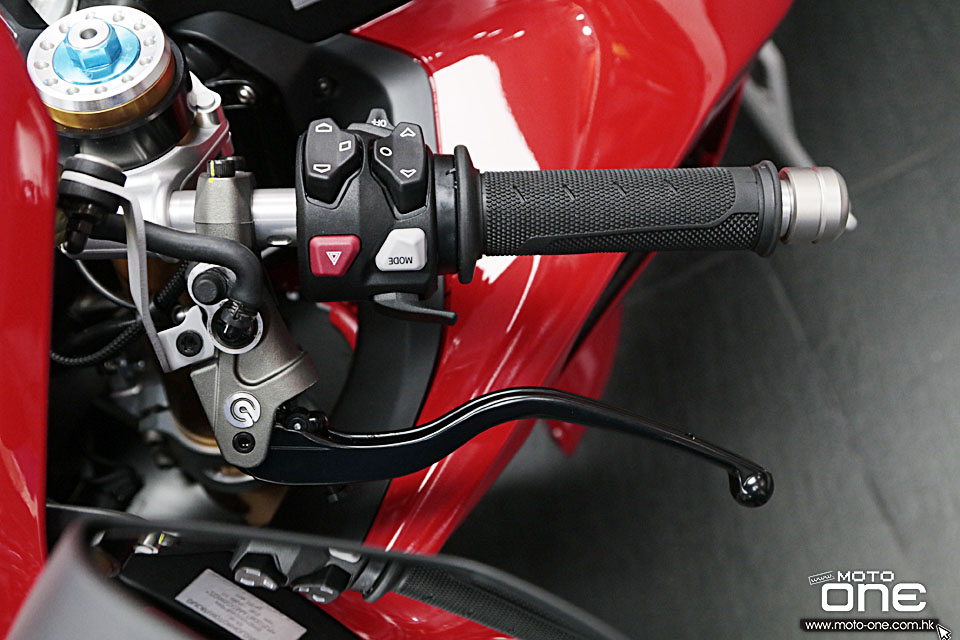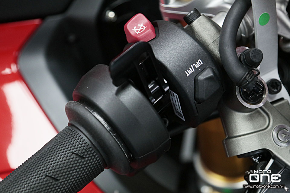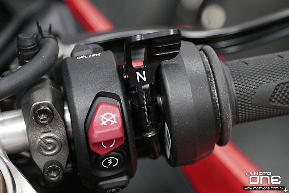 Ducati Neutral Lock與手把控制—為了防止在降檔過程中意外從1波切入空波,Ducati開發了名為Ducati Neutral Lock的專利系統。若要進入空波,騎士必須操作位於右側手把上的專屬撥桿,這與MotoGP和V4R WSBK廠車操作方式完全相同。
