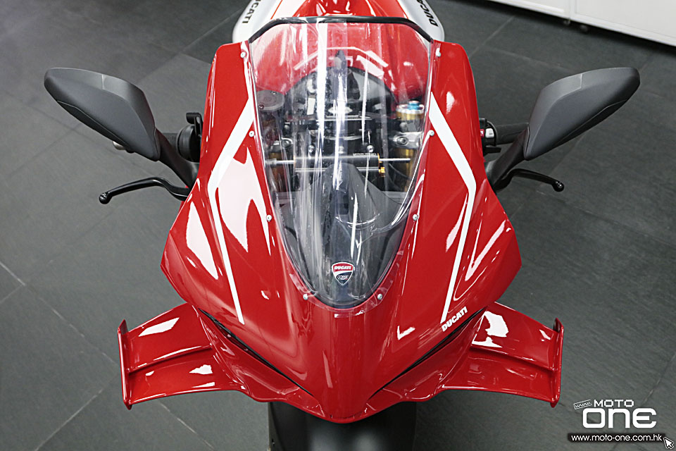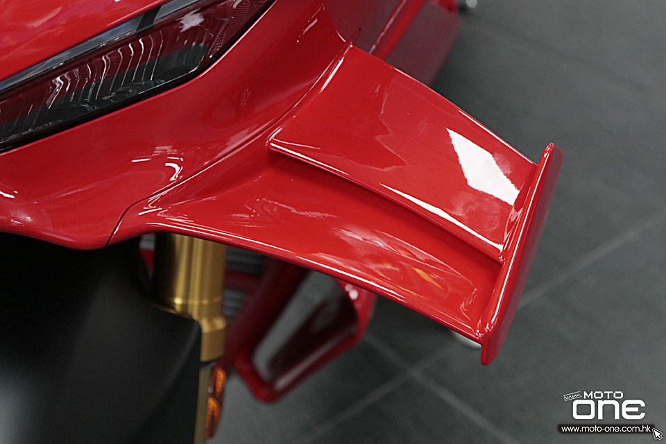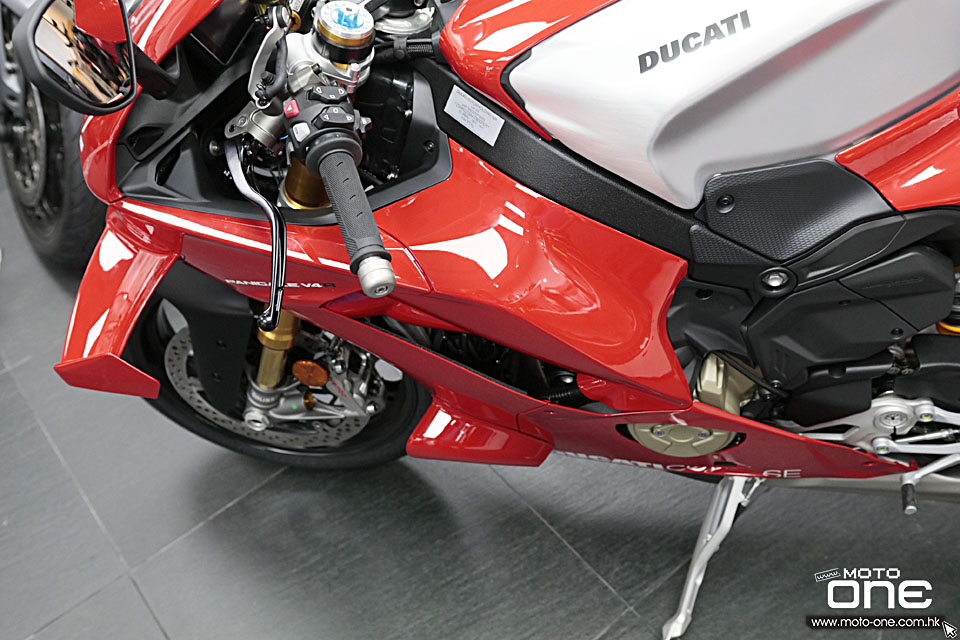 全新空氣動力學部件 全新V4R改用比比舊款更大定風翼,而車頭與定風翼的外型與新款V4及V4S相似,定風翼的體積亦較舊款巨大。DUCATI表示全新前定風翼相比現有車款,可增加 25% 的下壓力,換言之,下壓力在時速 270 公里時增加 4.8 公斤,在時速 300 公里時則提升至 6 公斤。