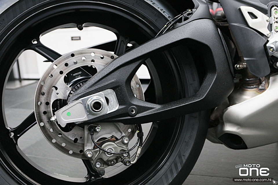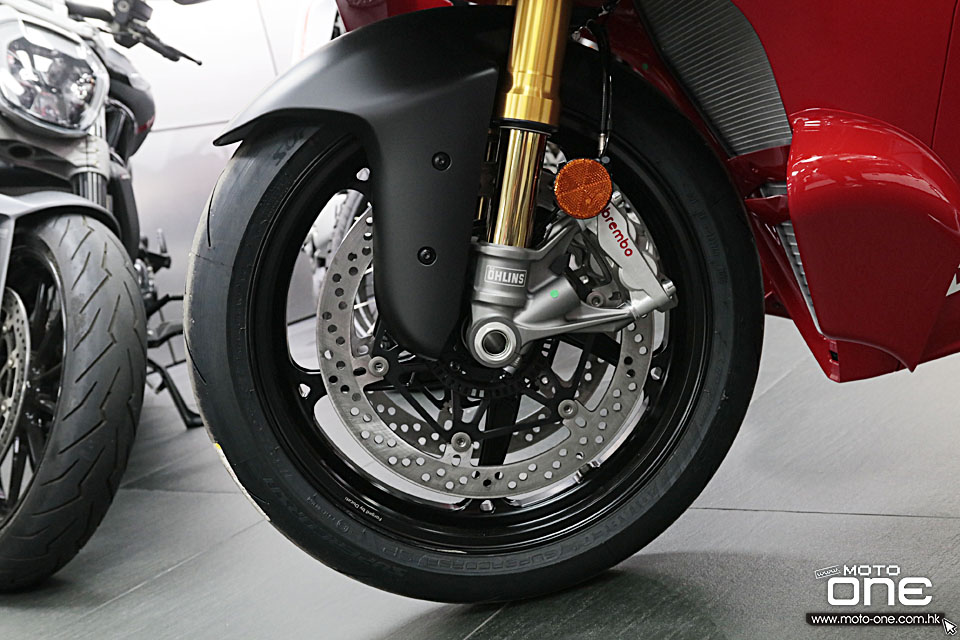 電子設備 全新 Ducati Vehicle Observer (DVO),模擬 70 個外部感測器,提升電子輔助反應。 慣性測量單元移至油缸下方,更接近重心,反應更準確。 功能包括:循跡控制 (DTC)、翹頭控制 (DWC)、側滑控制 (DSC)、彈射起步 (DPL)、引擎煞車控制 (EBC),全部可於行車中快速調整。 煞車防鎖系統有 7 個級別,分別適用賽道或公路。騎乘模式共有 5 種:Wet、Road、Sport、Race A、Race B。