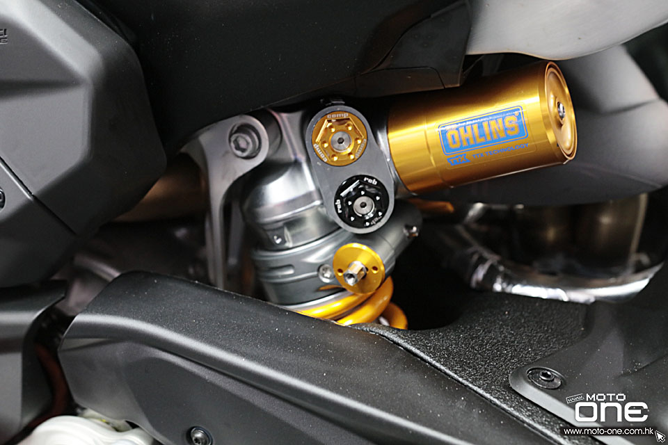 全調校 Öhlins TTX36 後避震,具備回彈、壓縮及預載調校功能。其高度可調範圍比前一代 V4 R 更大(32.4 毫米,相較於以往只有 13 毫米的行程)。