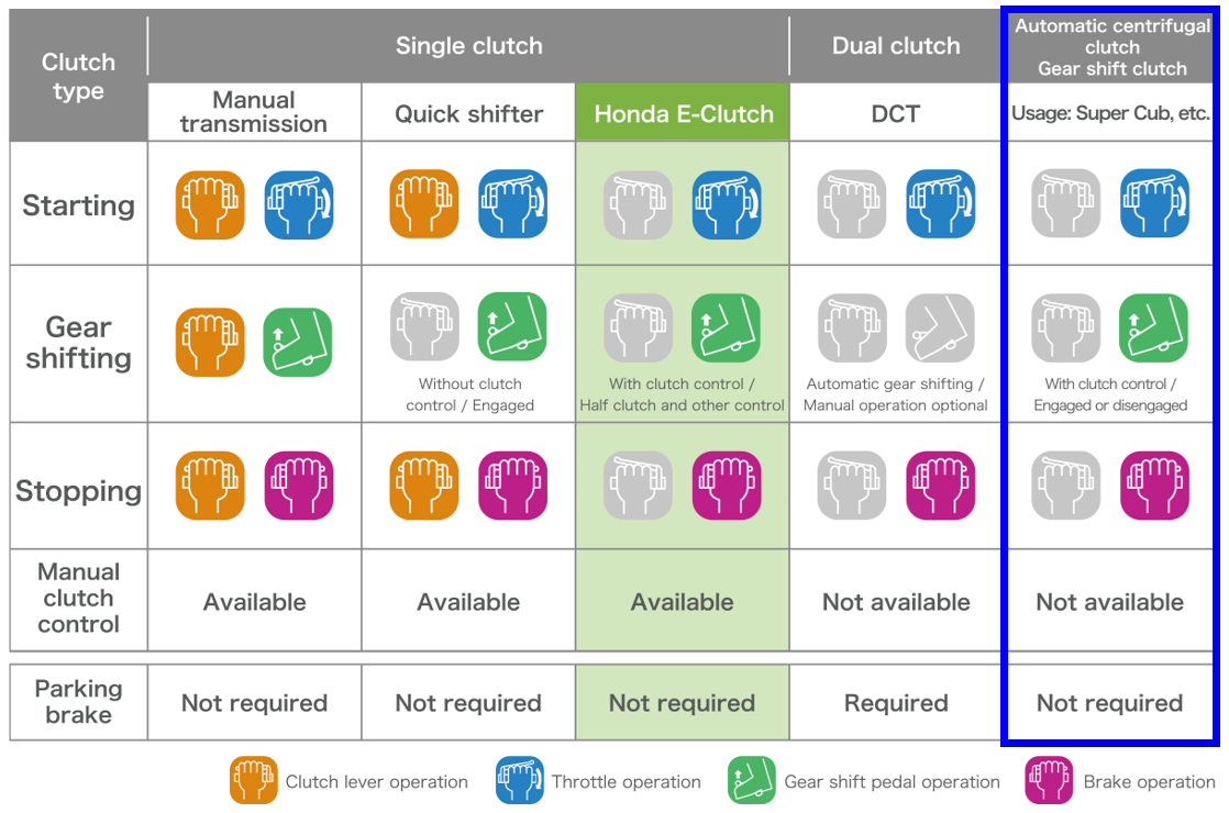 無須離合器操作亦不會熄火的半自動變速系統 Super Cub 110採用自動離心式離合器,沿用逾六十年至今,為本田 DCT・E-Clutch 等變速科技的先軀。 於日本,大部份原付二種(125cc)牌照的駕駛者只有自動波(AT)牌照。 由於無需離合器操作,在日本法規中Super Cub 110即使自動波(AT)牌照亦可駕駛,享受比綿羊車種更自由的操控感。