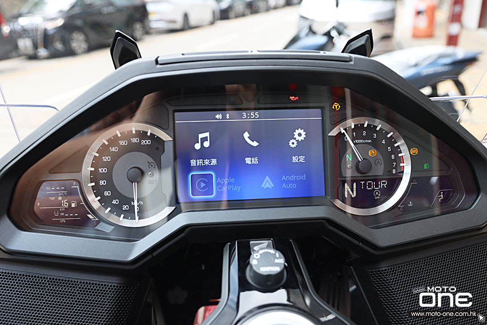 ●齊全電子裝備 圖片顯示預設的TOUR(巡航)馬力模式;新GOLD WING轉用電子油門後,為騎士提供Tour(巡航)、Sport(運動)、Eco(省油)及Rain(濕地)的馬力模式。而電子避震、電子風擋高度、油門反應、ABS防鎖死煞車也會按每個模式自行設定,例如騎士喜歡敏捷加速力可選用Sport(運動),電子避震設定較硬,讓騎士可更穩定地攻彎。喜歡舒適巡航可選用Tour(巡航),電子風擋升至最高,HSTC循跡系統只有選用Tour模式後才介入(其他模式不訪循跡系統)。要達至省油及避免濕地打滑可選用Eco(省油)或Rain(濕地)。而圖左顯示騎士圖案是避震預載調校,騎士可選擇雙騎、單騎或雙騎/行李的設定,換句話有不同吸震效果。