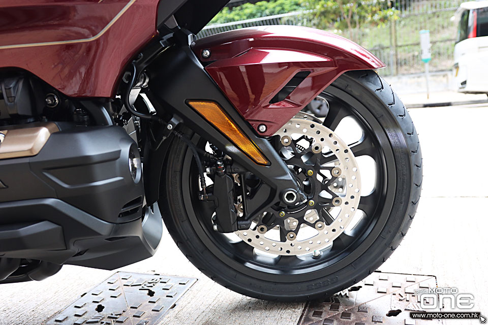 ●Double-Wishbone前叉 新GOLD WING另一焦點是採用Double-Wishbone(類似汽車雙願骨)前避震;有別傳統的套筒前叉,Double-Wishbone的左及右前叉並沒有吸震功能,而SHOWA單筒前避震設於前叉與軑把之間,結構與BMW的Duolever避震相似,優點之一是急煞情況下,不會發生傳統前叉因過渡下沉導致無法轉彎的問題,而部件之間的磨擦更少,使轉向更靈活,同時提升整個行駛過程的平穩度,據HONDA表示Double-Wishbone可以過濾從路面傳至軑把30%震盪。但根據之前駕駛使用類似結構避震的電單車,由於減速時的俯衝力大減,與傳統前叉出現較大分別,因此駕駛初需要一點時間適應。