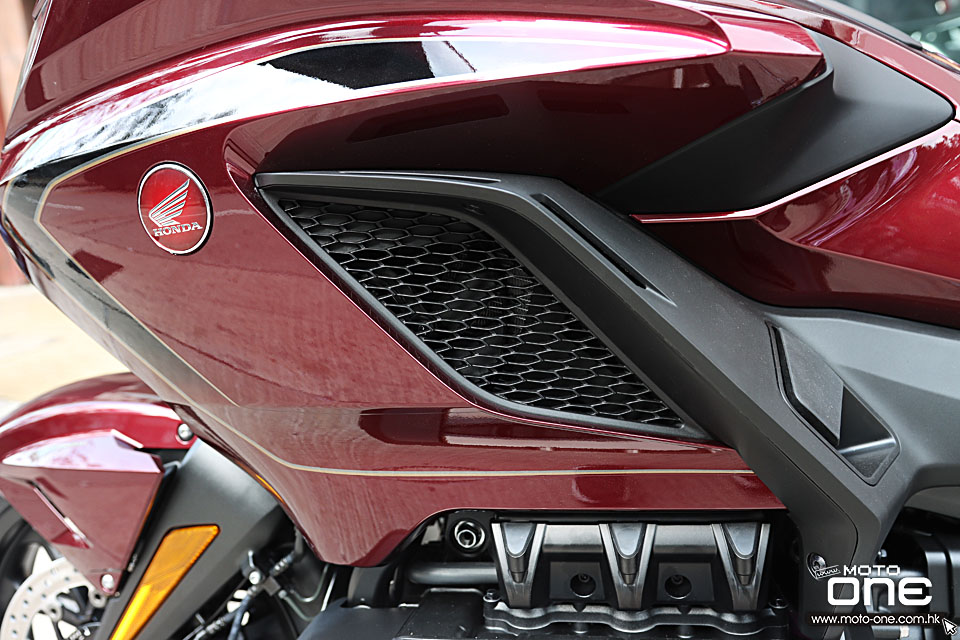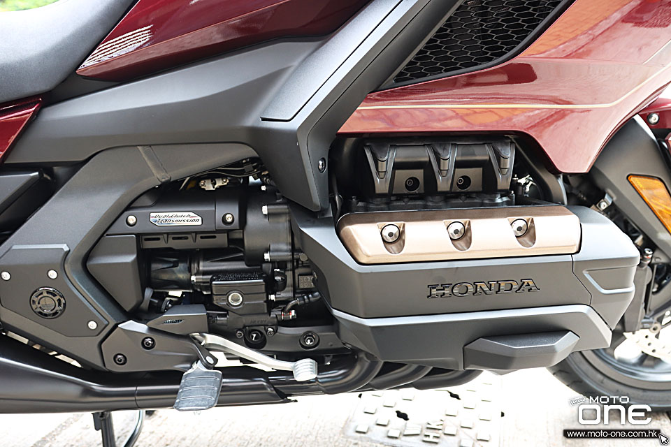 ●體積更細更高性能的水平對向6缸引擎-1,833cc 水平對向6氣缸引擎已成為HONDA GOLD WING的標記,而上一代的引擎只是使用單凸輪軸SOHC每缸2氣門規格,新引擎卻是每缸4氣門,意味著有更高馬力及扭力輸出。理論上,使用4氣門的新引擎理應更大更重,但廠方為了達到減磅瘦身及更多馬力輸出目標,因此移植HONDA越野車-CRF的Unicam氣門機構,好處是配置搖臂的單凸輪軸發揮雙凸輪軸DOHC的優點,控制每缸4氣門,加速力及扭力較舊引擎提升之餘,配合其它新科技下,廠方表示燃油效益提升20%,換句話說更省油,即使新GOLD WING使用21升油缸,較舊款少4升,但注滿氣油後的總行駛里數不少於舊GOLD WING,而更細容積油缸的好處是可以縮減車身體積及減少重量。